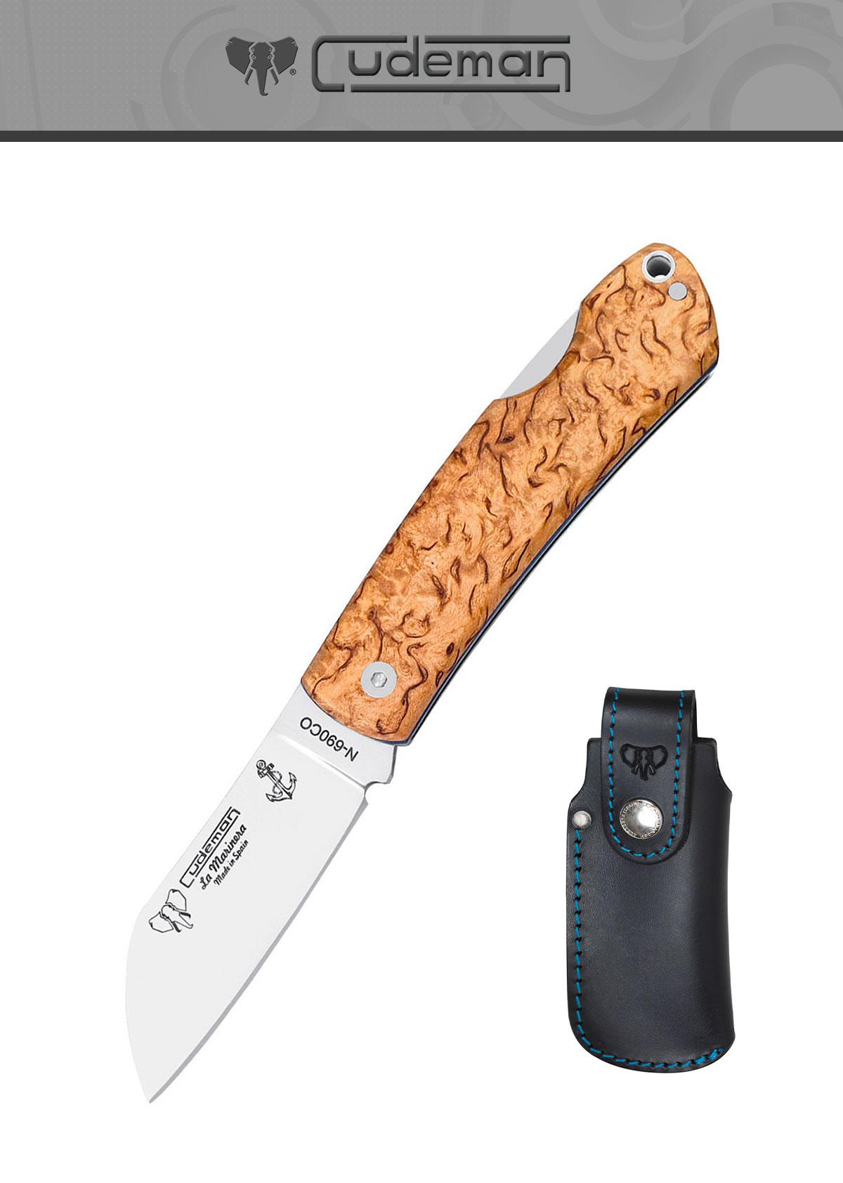 Couteau de poche avec manche en bois de bouleau bouclé et serrure à bouton arrière.