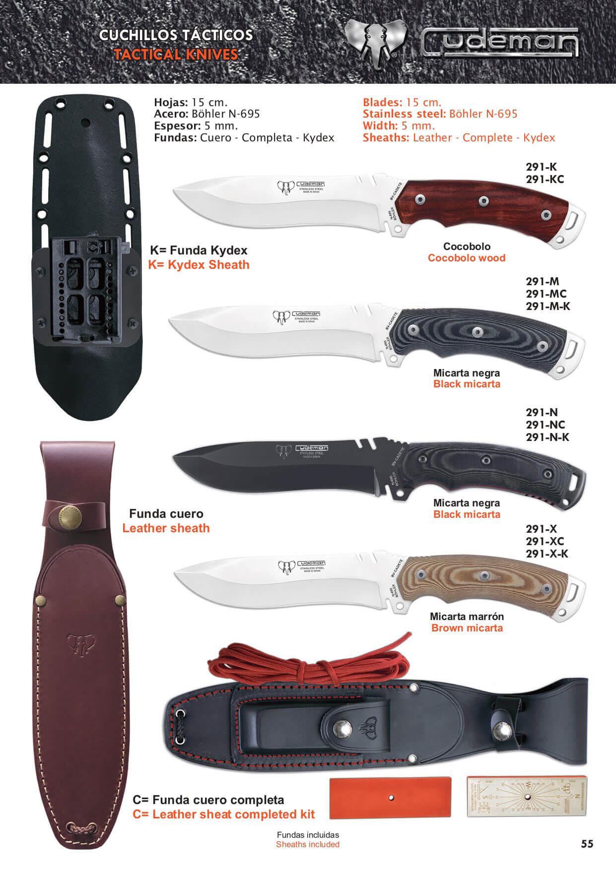 Couteaux complets avec écailles mikarta de différentes couleurs ou bois de cocobolo. Fabriqué en acier Böhler N-695, dureté 59-61. Avec trou pour cordon. Pointe brise-cristal. Fermeture éclair sur le bord pour une meilleure adhérence. Couper les fils Encapsulateur de balle