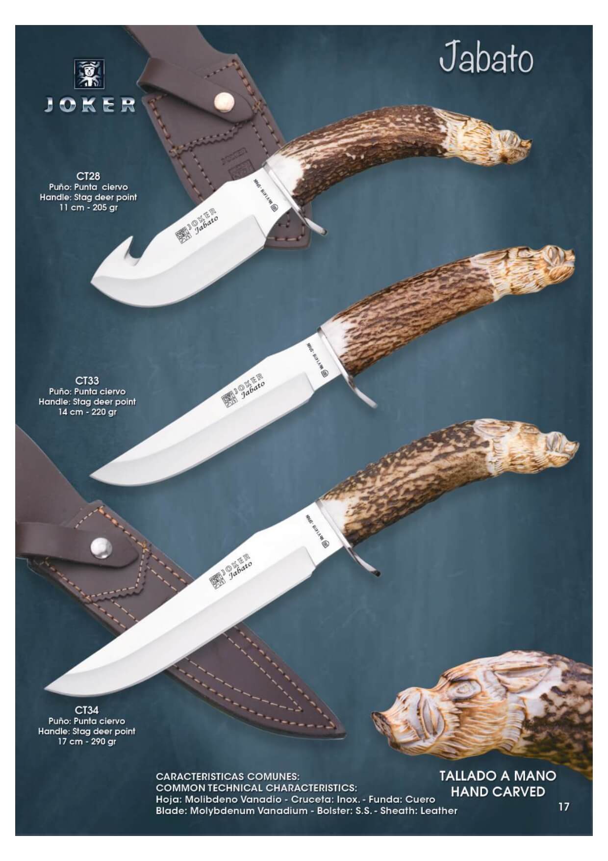 Couteau de chasse Joker Jabato avec manche en bois de cerf sculpté à la main. Lame en acier au molybdène vanadium et croisillon en acier inoxydable. Avec étui en cuir marron.