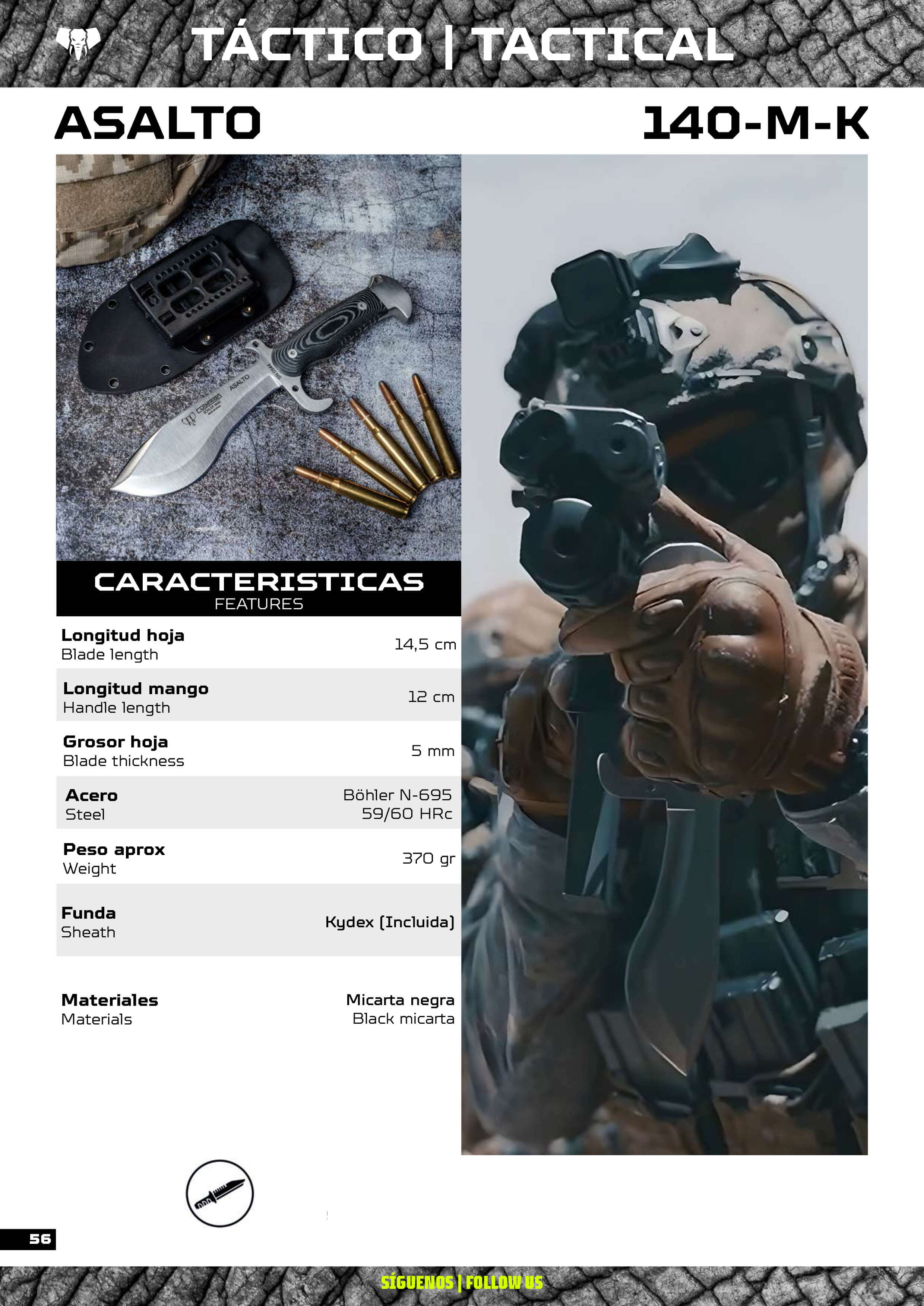 Couteau tactique complet avec manches en mikarta, lame en acier Böhler N695 et étui en Kydex.