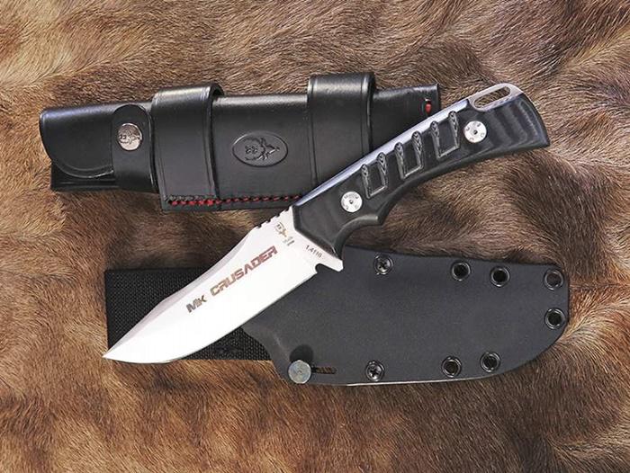 Couteau Muela CRUSADER. En acier 1.4116 (X50CrMoV15) et écailles de micarta noires. Avec des mesures de lame de 125 mm et poignée de 125 mm. Le modèle est présenté avec deux options de manchon, une en kydex, avec un détail très pertinent, un petit verrou pivotant qui vous permettra d'ajuster la sortie du couteau et aussi la possibilité de le faire multi-position avec un adaptateur. Aussi la version cuir qui est ambidextre et multiposition.