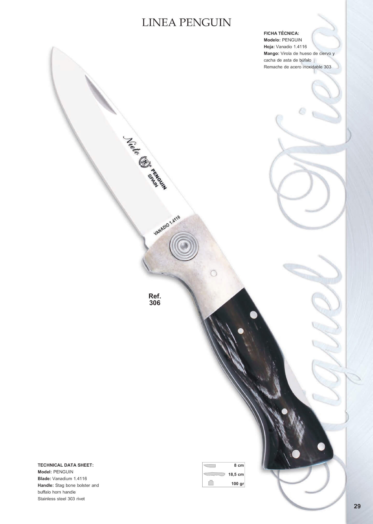 Couteau de poche. Ligne PENGUIN Lame: Acier Vanadio 1.4116303 rivet en acier inoxydable. 306Poignée: Sellette d'os cerf et corne de buffle poignée. Longueur de la lame de 8 cm. La longueur totale 18,5 cm. 100 g de poids.