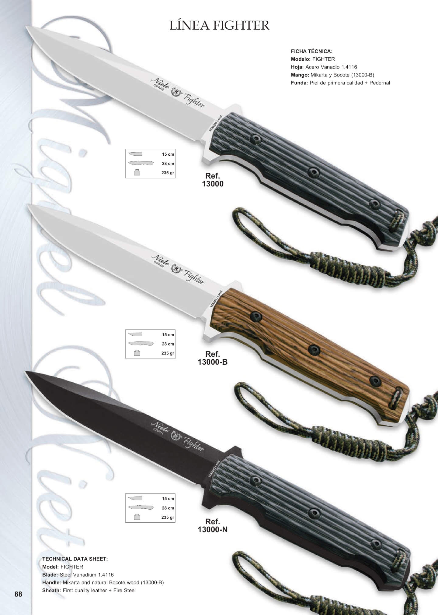 Couteaux monobloc en acier Vanadium 1.4116 avec une lame de 15 cm. Longueur totale 28 cm. Comprend un étui en cuir de qualité supérieure et une pierre à feu. Poids: 235 gr.