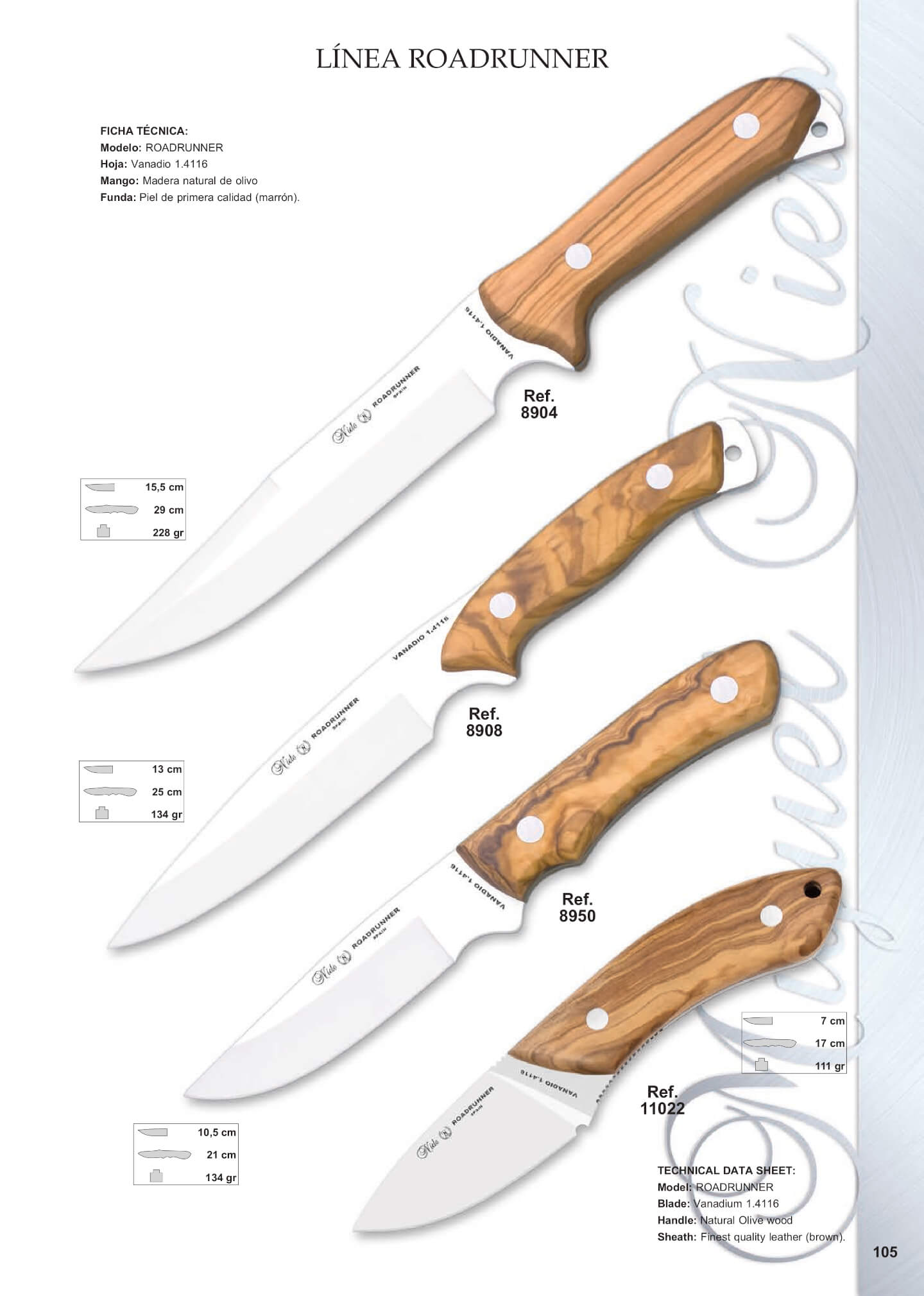 Lama in acciaio Vanadio 1.4116, manico in legno naturale di oliva e rivetti in acciaio inox 330. Pelle Premium (marrone).