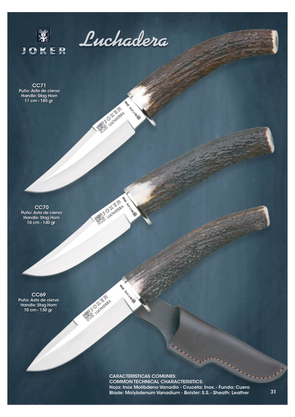 Coltelli da caccia. Scheda di molibdeno vanadio acciaio inox. Pugno di Staghorn. spatola inox. Custodia in pelle.