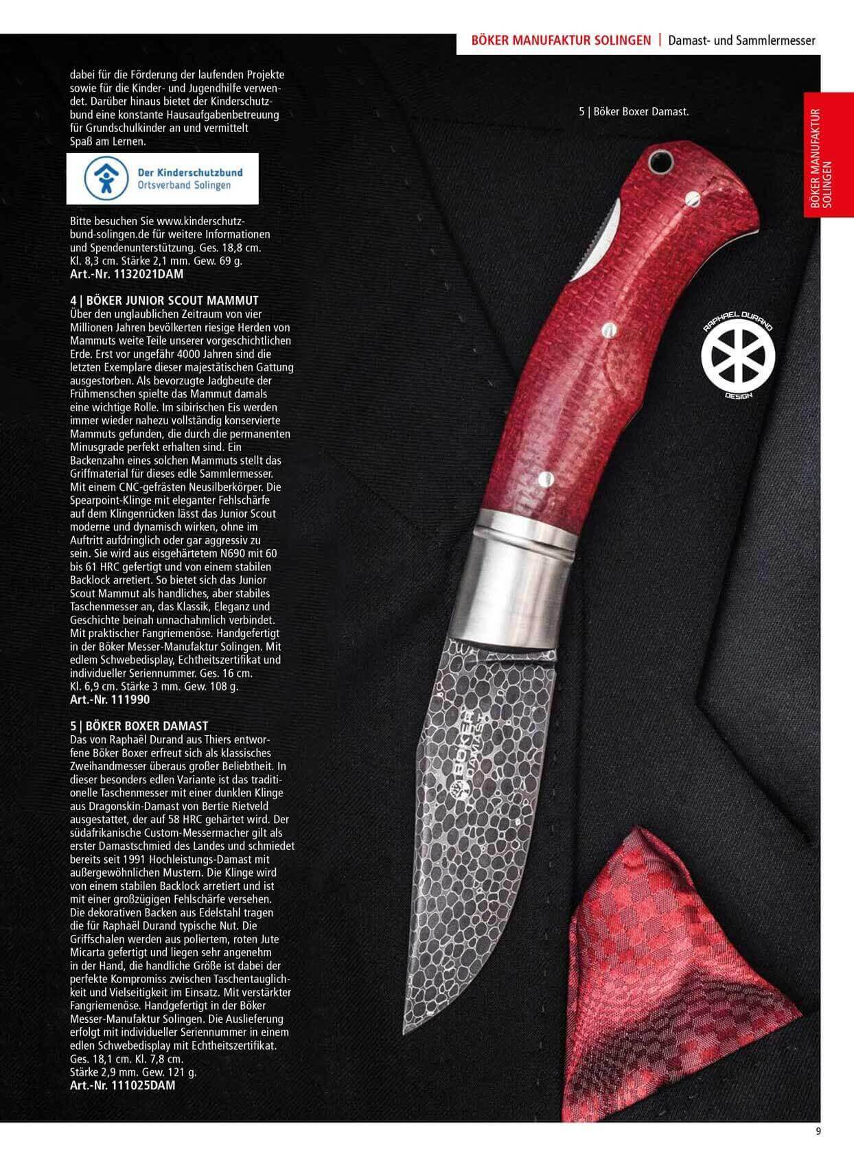 Il Boker Boxer, disegnato da Raphaël Durand, è estremamente popolare come classico coltello a due mani. In questa versione particolarmente elegante, il tradizionale coltellino tascabile è dotato di una lama scura in acciaio Dragonskin Damasco di Bertie Rietveld, temprata a 58 HRC. La lama ha un blocco del pulsante posteriore. I rinforzi decorativi in acciaio inossidabile presentano la tipica scanalatura Raphaël Durand. Le bilance del manico sono realizzate in micarta di iuta rossa lucida e sono molto comode da impugnare. La pratica dimensione è il perfetto compromesso tra praticità della tasca e versatilità di utilizzo. Con foro per cordino rinforzato. Fatto a mano nella fabbrica di coltelli Boker a Solingen. Si tratta di una serie numerata con certificato di autenticità.