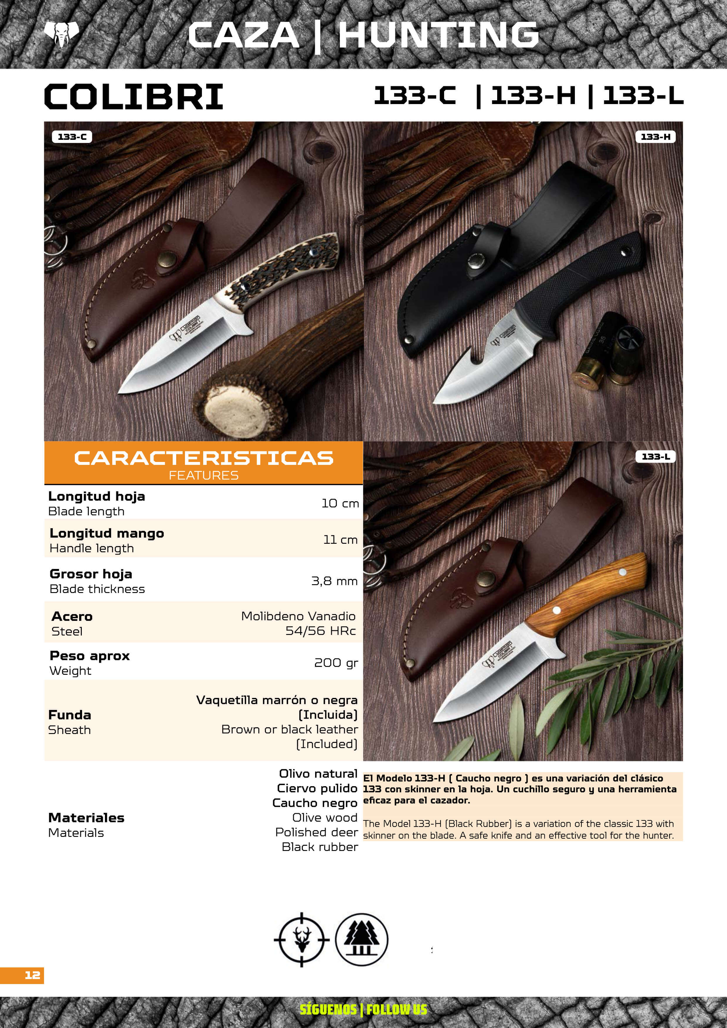 133: Coltello full tang con lama in acciaio al vanadio molibdeno. Lunghezza lama: 10 cm, lunghezza totale: 21 cm. Spessore lama: 3.8mm. Larghezza pala 3,5 cm. Lama con cavità concava e punta a goccia. Custodia in pelle marrone inclusa.
