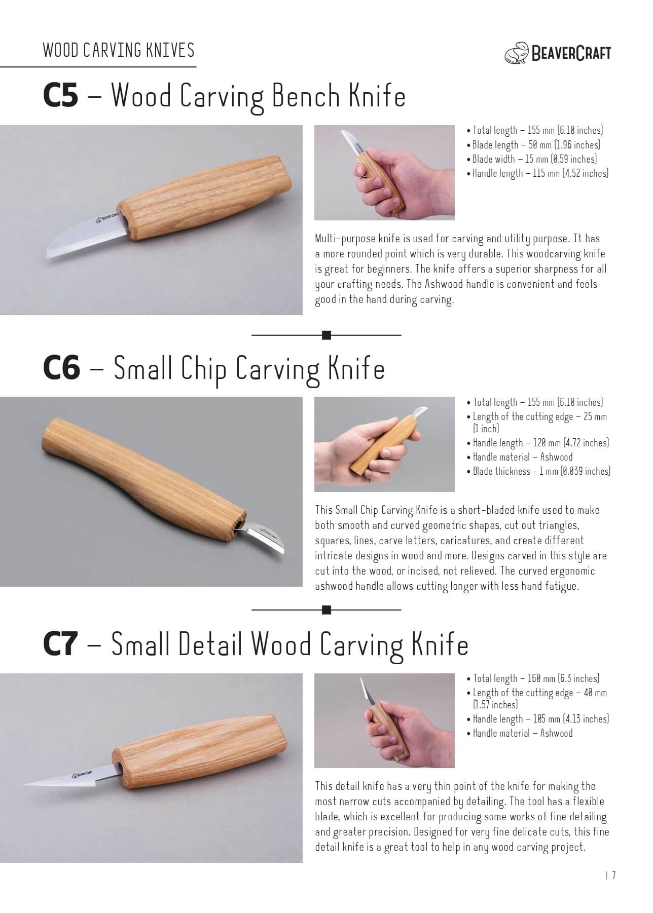 Coltelli da intaglio con lame in acciaio al carbonio e manici in legno di frassino. Questi coltelli sono ideali per qualsiasi attività di intaglio e per qualsiasi tecnica, ad esempio per piccoli dettagli. Sono utili anche per i principianti o per gli intagliatori più esperti. Hanno lame robuste che vi permetteranno di eseguire tagli più grandi senza alcuno sforzo. Coltelli perfetti per le vostre sculture in legno.