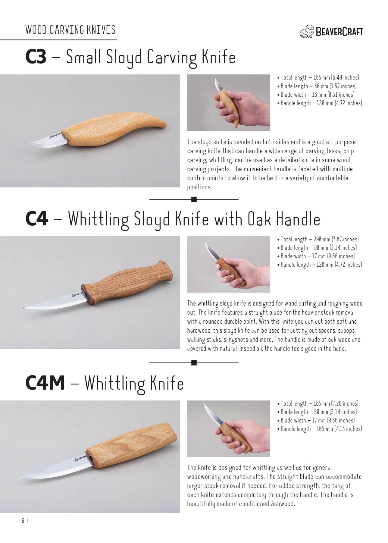 Coltelli da intaglio con lame in acciaio al carbonio e manici in frassino e quercia. Questi coltelli sono progettati per l'intaglio di pezzi più piccoli, per l'intaglio di aree più grandi o anche per l'intaglio di aree più dettagliate. Questi coltelli hanno una lama molto resistente e i loro manici permettono di tenerli comodamente da diverse posizioni.