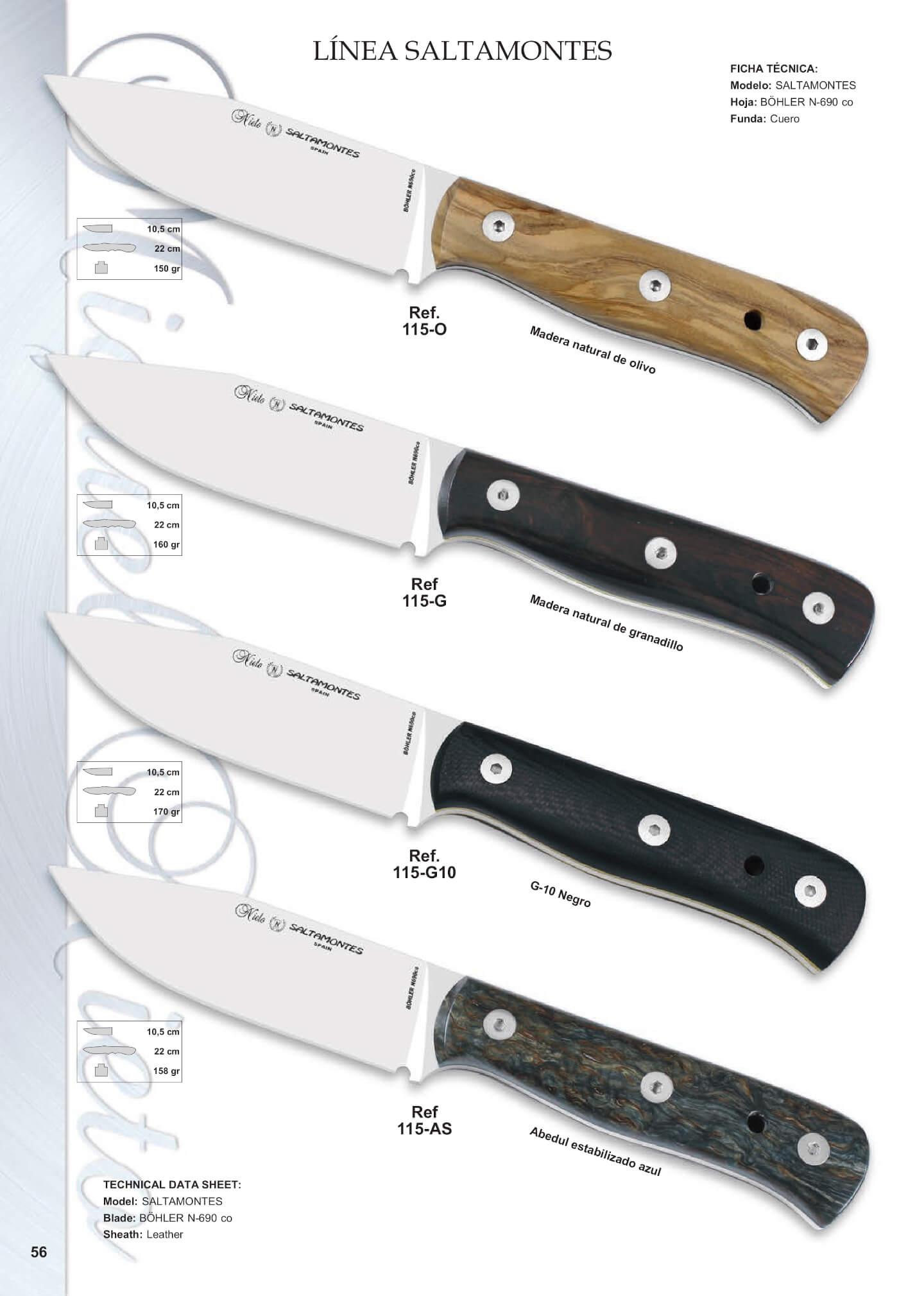Coltelli Nieto Saltamontes monopezzo con lama in acciaio Böhler N690Co e fodero in cuoio.