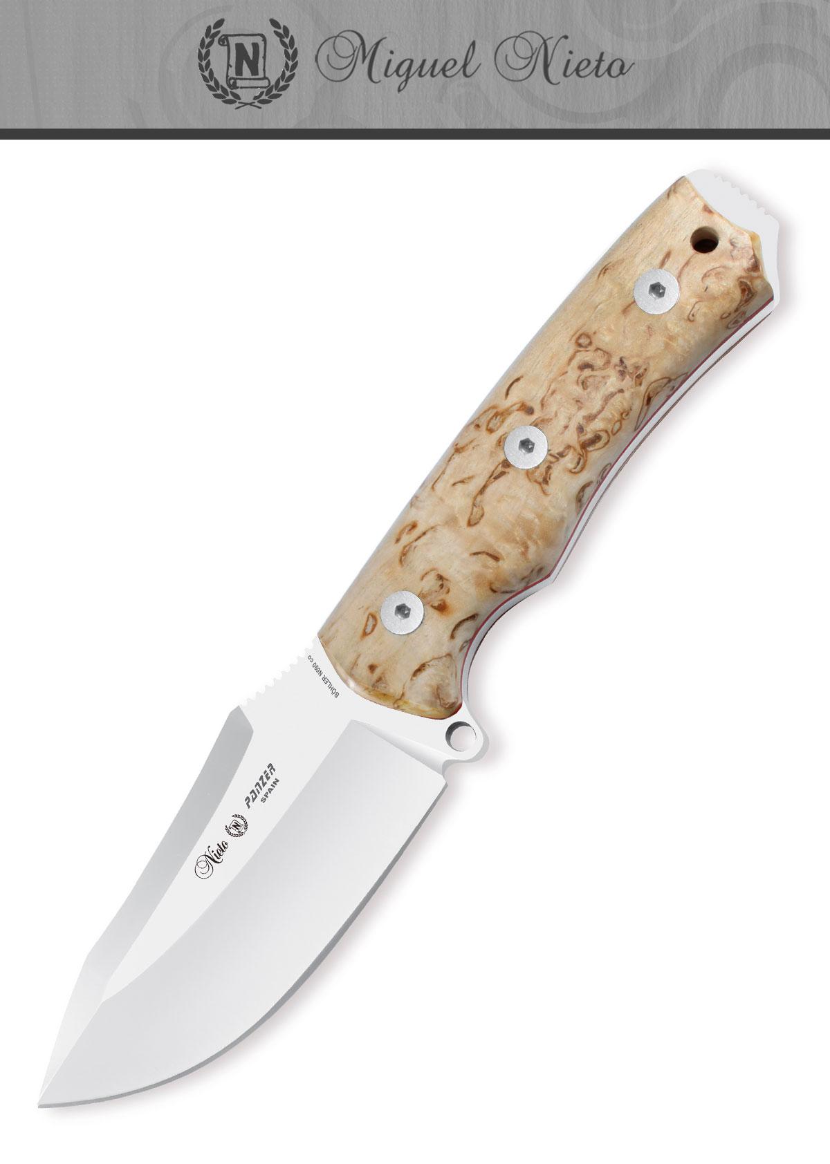 Coltello monopezzo con manico in legno di betulla. Lama in acciaio Böhler N690Co ad alto contenuto di cromo e carbonio. Questo coltello in acciaio inossidabile ha una lama lunga 9,5 cm e una punta a goccia. Spessore lamiera 5,3 mm.