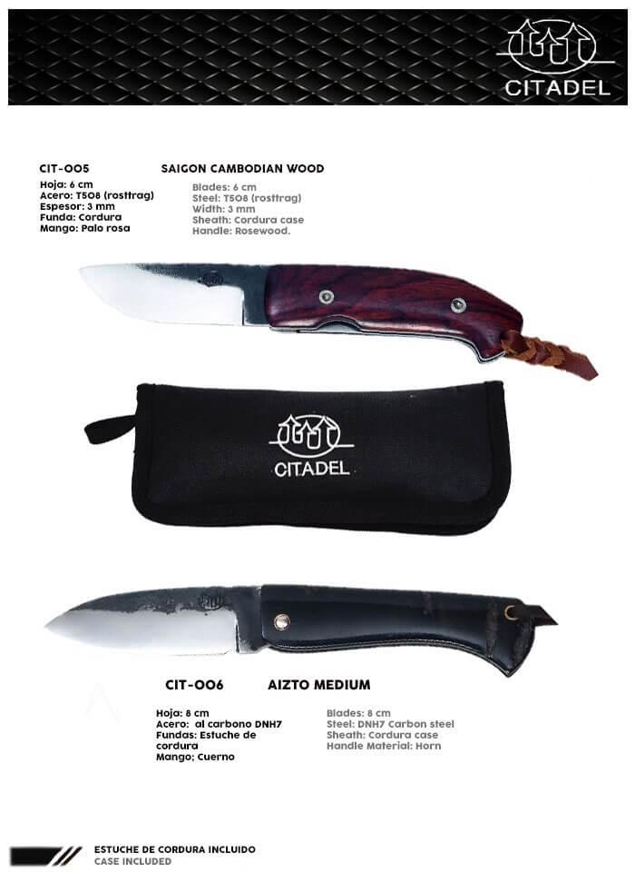 CIT-005: SAIGON CAMBODIAN WOODLama: 6 cmAcciaio: T508 (rosttrag)Spessore: 3 mmFodero: CorduraManiglia: palissandroCIT-006: AIZTO MEDIUMLama: 8 cmAcciaio: acciaio al carbonio DNH7Spessore: 3 mmFodero: custodia in corduraManiglia: corno