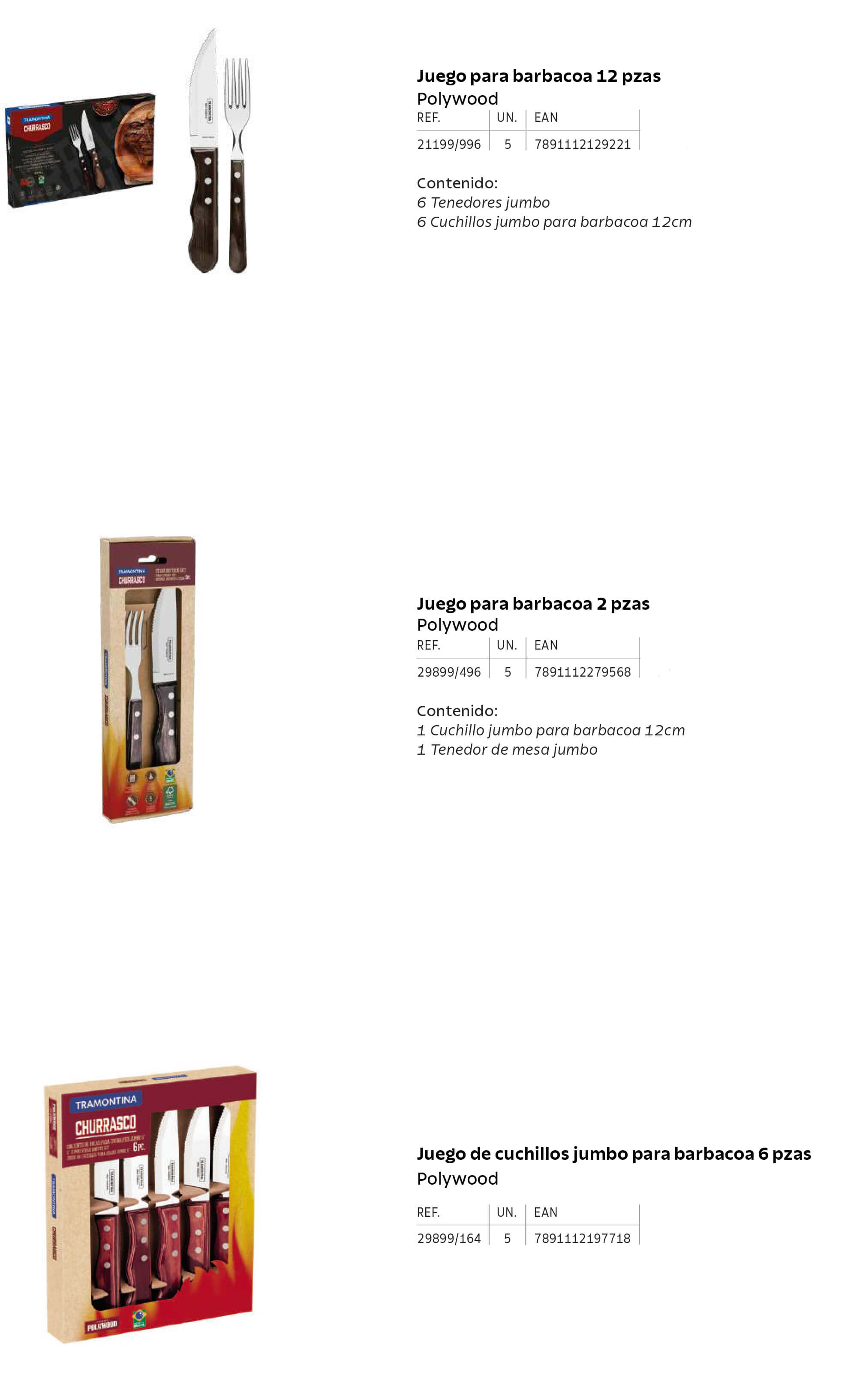 Set di coltelli per il barbecue o per la cucina con forchette e coltelli da bistecca. Set di diverse dimensioni, da 12 a 2 pezzi. Con essi potrete preparare grigliate perfette con gli amici o la famiglia. Pezzi in acciaio inox e legno di polipropilene.
