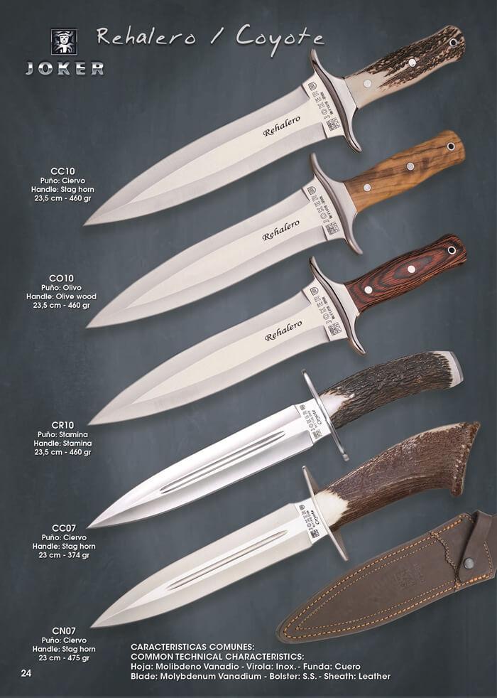 Molybdän-Vanadium-Stahlklinge von 23,5 cm mit Doppelschneide. Braune Ledertasche. Griffe aus Hirschgeweih, Olivenholz oder Stamina.