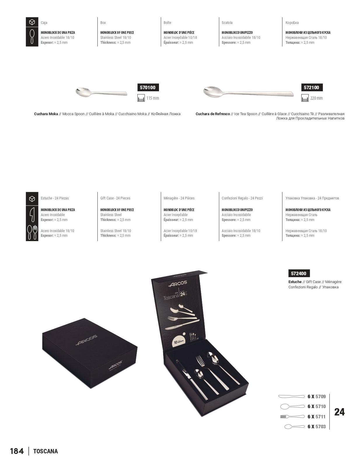 Besteck Messer, Gabeln und Löffel aus Edelstahl einteilige Monoblock. Box mit 24 Stück. Dicke 2,5 mm. Toskana Modell.