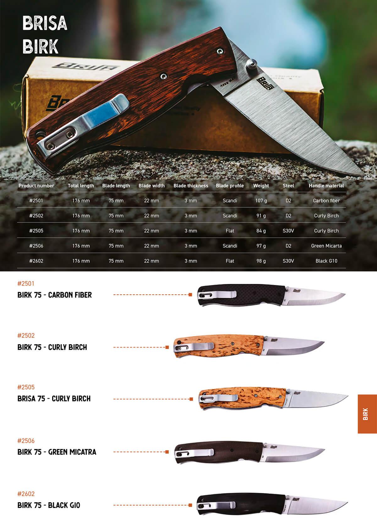 Erhältlich in verschiedenen Griffmaterialien: Maserbirkenholz, grünes Micarta, schwarzes G10 oder Kohlefaser.