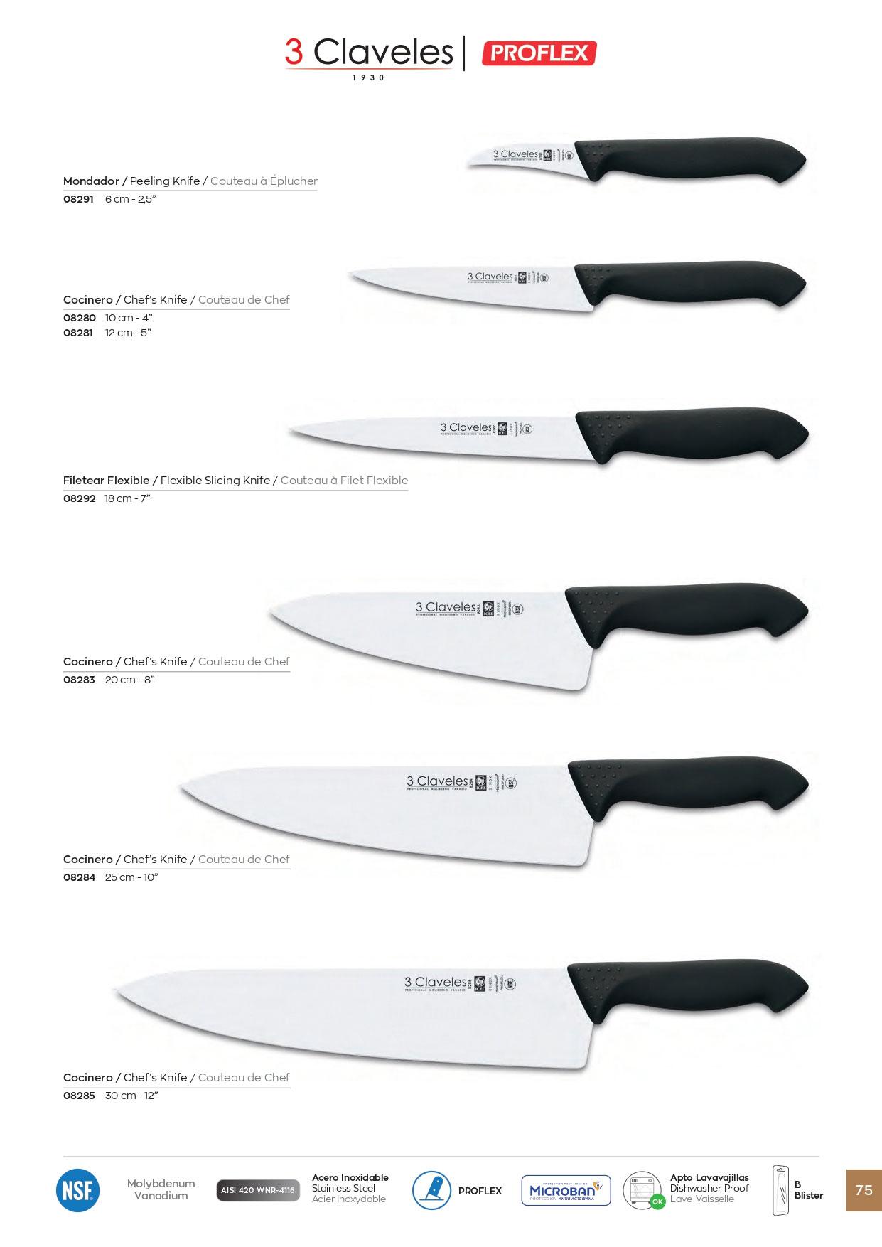 Professionelle Küchenmesser, Klinge aus rostfreiem Stahl. Proflex Griff. Peeler, Chef, Chef Einsatz, Filet flexibel.
