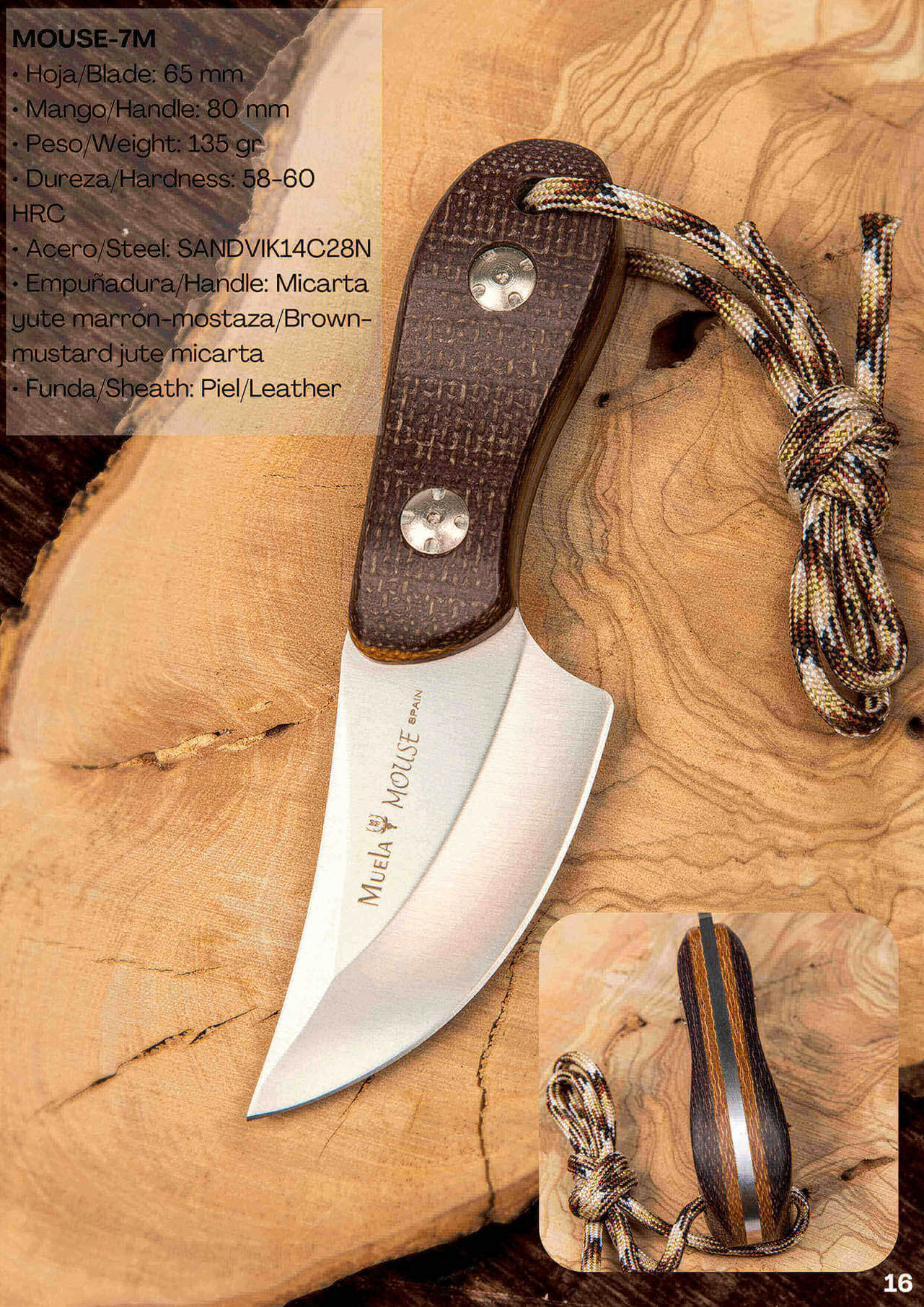 Muela Mouse Jagdmesser.Ein kleines Jagdmesser mit einer 6,5 cm langen Full-Tang-Klinge aus rostfreiem Sandvik 14C28N-Stahl. Sein Griff besteht aus braunem Jute-Micarta. Inklusive Lederetui.