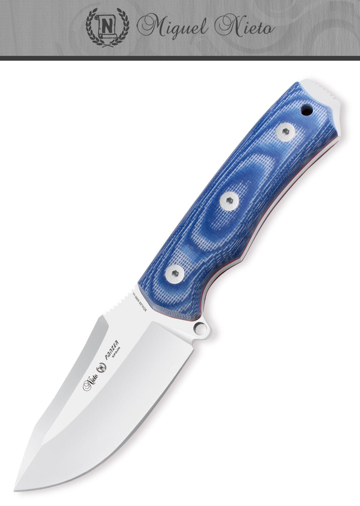 Fulltang-Messer mit blauem Micarta-Griff. Böhler N690Co Stahlklinge mit hohem Chrom- und Kohlenstoffanteil. Dieses Edelstahlmesser hat eine 9,5 cm lange Klinge und eine Drop-Point-Spitze. Klingenstärke 5,3 mm.