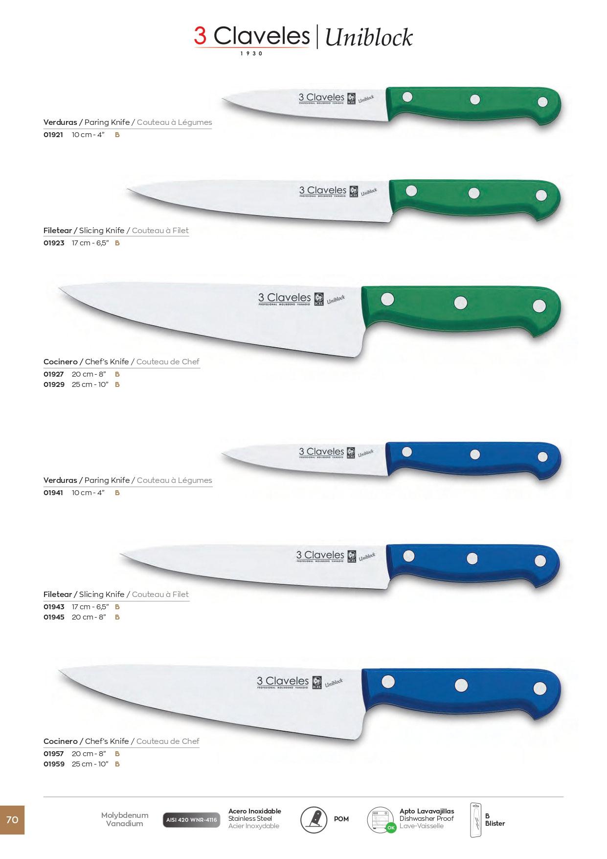3 Claveles Uniblock-Filetiermesser mit 20 cm Klinge und blauem PO...