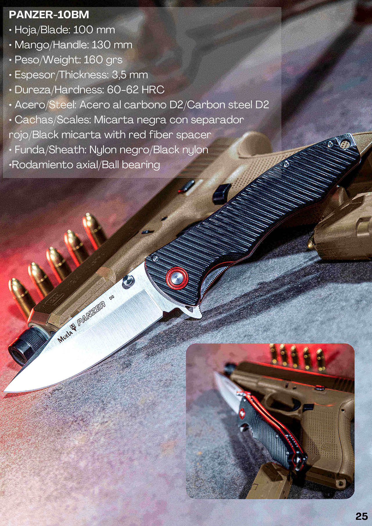 Ein kraftvolles Messer, mit einer 10 cm langen und 3,5 mm dicken Klinge aus D2-Kohlenstoffstahl, mit Linerlock. Sein Griff besteht aus schwarzem Micarta mit roten Trennwänden.