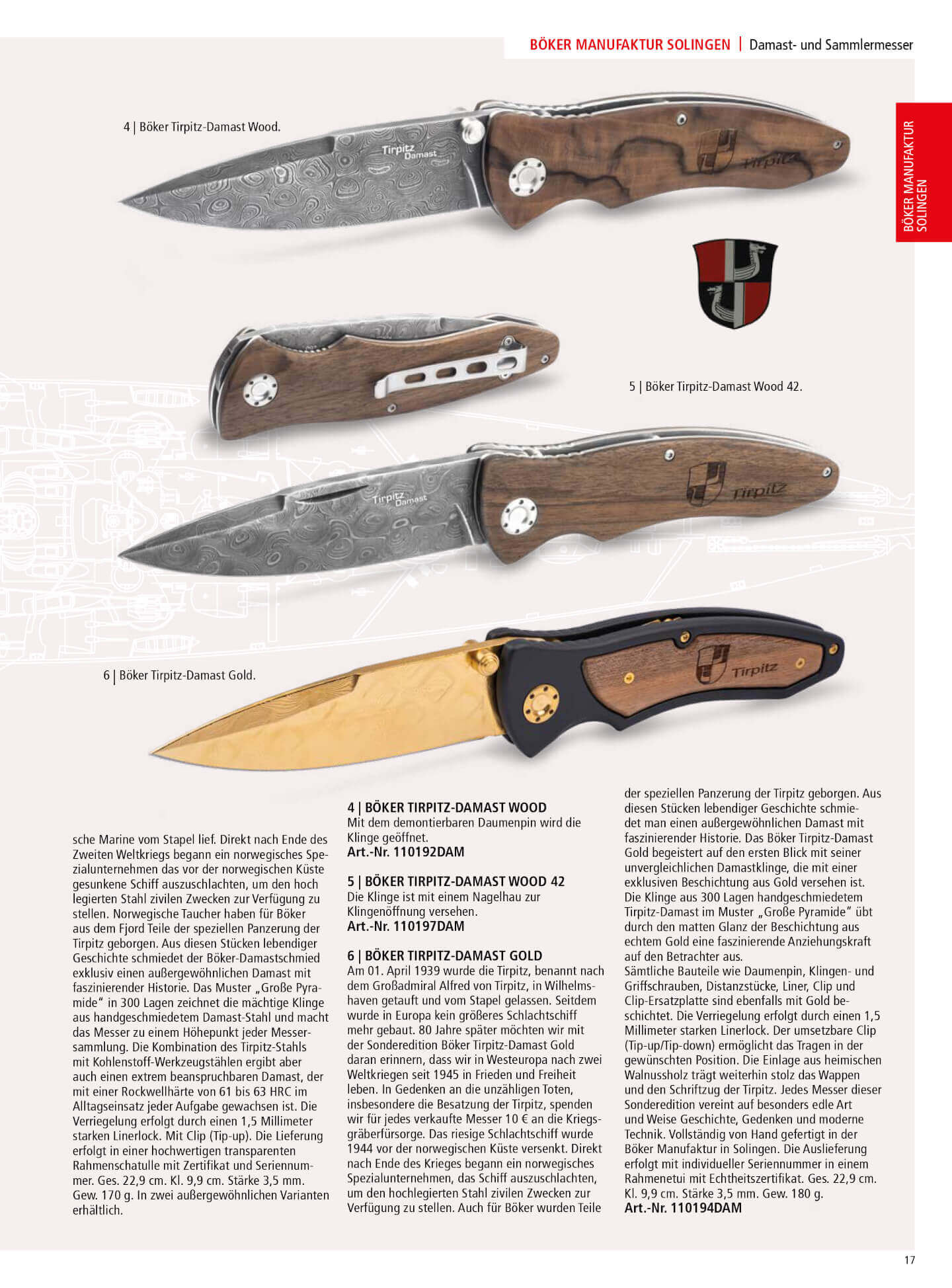 Diese Messer sind mit einer Klinge aus Tirpitz-Damaststahl gefertigt, dieser Stahl wird mit Teilen des imposanten Tirpitz-Schlachtschiffs gewonnen, dem größten bisher in Europa eingesetzten, das 1944 vor der Küste Norwegens sank, Jahre später rettete Böker Teile davon selbst seinen imposanten Tirpitz-Damast herzustellen, der durch die Kombination mit Kohlenstoffstählen eine große Härte erreicht, die ihn zusammen mit seiner Schönheit zu einem hochwertigen Sammlermesser macht.