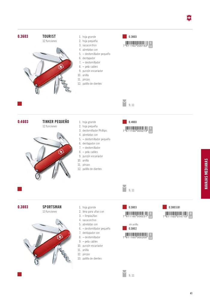große Klinge, kleine Klinge, Korkenzieher, Reibahle, Dosenöffner, 3 mm Schraubendreher, Flaschenöffner, 6 mm Schraubendreher Stripper, Ring, Zahnstocher, Pinzette.