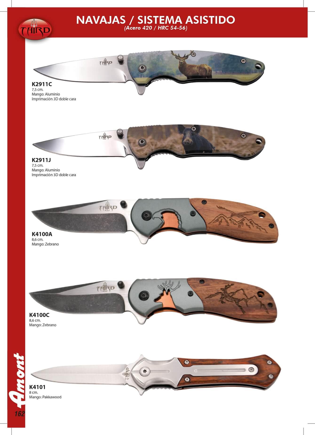Messer mit unterstützter Öffnung. Stahlblech 420. K4100A Griff: Zebrano. Blatt: 8,6 cm. K4100C Griff: Zebrano. Blatt: 8,6 cm. K4101 Griff: Pakkawood. Blatt: 8 cm.